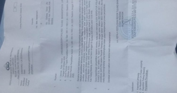 Hal itu merujuk pada surat pemberitahuan perkembangan hasil penyelidikan yang diterbitkan Polres Tulang Bawang tertanggal 20 Oktober 2025. Dalam surat tersebut disebutkan bahwa laporan polisi terkait dugaan tindak pidana “setiap orang yang dengan sengaja melakukan tipu muslihat, serangkaian kebohongan, atau membujuk anak untuk melakukan persetubuhan dengannya atau dengan orang lain” sebagaimana dimaksud dalam Pasal 81 ayat (2) jo Pasal 76D Undang-Undang Nomor 23 Tahun 2002 tentang Perlindungan Anak, telah diterima dan masuk tahap penyelidikan.