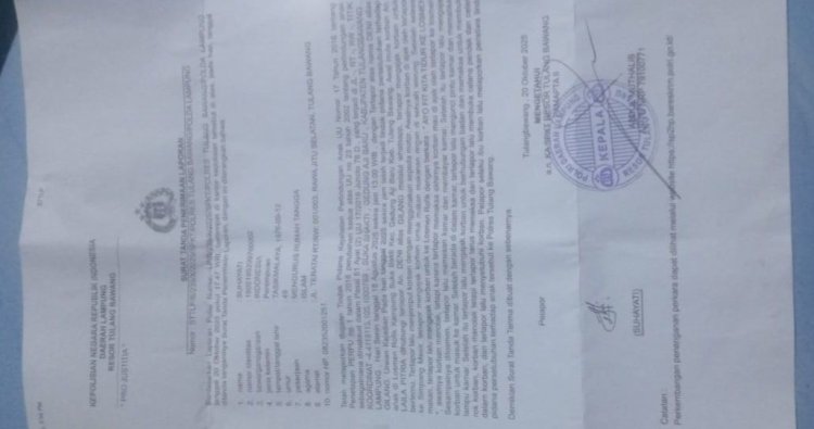 Hal itu tertuang dalam Surat Tanda Penerimaan Laporan (STPL) yang diterbitkan Polres Tulang Bawang tertanggal 20 Oktober 2025. Laporan tersebut diajukan oleh seorang ibu rumah tangga berinisial S (49), warga Rawa Jitu Selatan, Kabupaten Tulang Bawang. Kamis [12/02/2026].